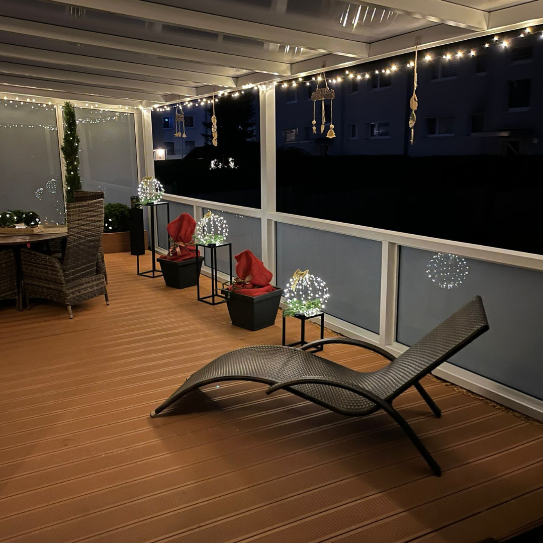 Oder im Winter – eingehüllt in eine Decke, mit einer heißen Tasse Tee – während dein Außenbereich still und friedlich glitzert.